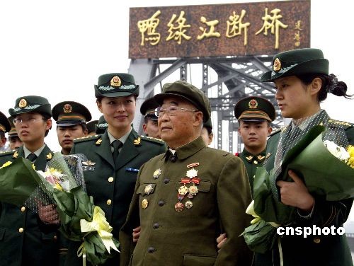 志愿军老战士鸭绿江边纪念抗美援朝58周年