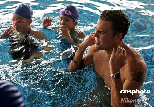 图:爱心大使前奥运冠军霍尔来京传授游泳技能