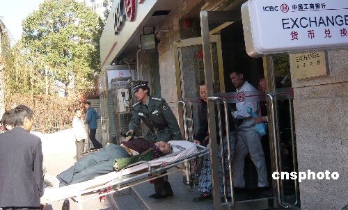 图:一老人在银行昏迷 众人相助抢救