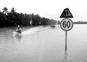 琼海嘉积镇多条道路遭受内涝。17日下午2时许,南国都市报记者徒步趟过3公里积水路段,来到上次受灾严重的嘉积镇桥头村委会。该村委会通往嘉积的两条道路豪华路、嘉博路部分路段积水超过1米。如果不是路边竖立的路灯,很难分清哪里是道路,哪里是路边水田。