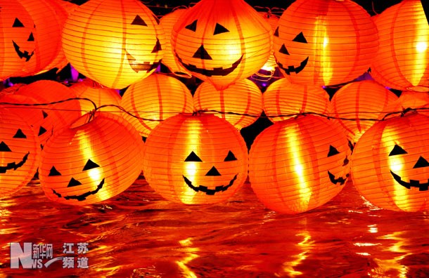 西方传统的万圣节临近,南京不少商家在店堂布置南瓜灯,以及造型怪异的“假面人”,借此吸引顾客,抢占商机。(王新 摄)