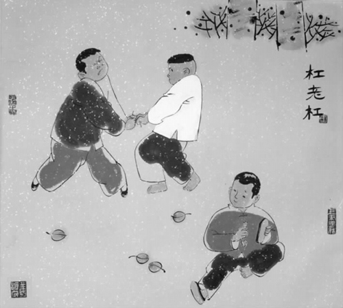 记得上小学时,每逢秋末,杨树叶子刮得满地都是时,好多男生的鞋里面,放着无数根杨树叶的柄,游戏时,两人从自己鞋中找一根粗而有韧性的杨树叶柄,济南叫老杠,用自己的老杠勾搭对方的老杠用劲拉,断者为输,孩子们视久战不断的“老杠”为宝贝,经常在小朋友面前从鞋里拿出来夸耀,这种游戏历史悠久,古代称“斗百草”,但这种鞋里藏老杠的游戏早已消失了。(姜振民 文/图)
