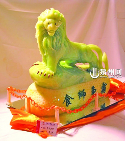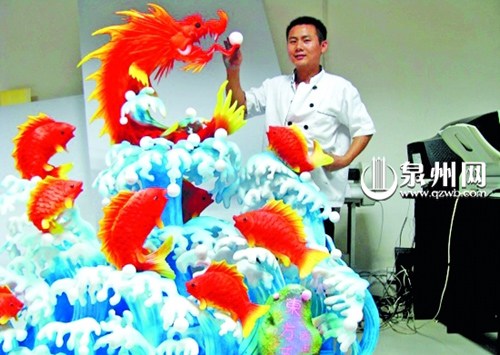 “飞天迎宾”、“鲤鱼化龙”“东方醒狮”、“渡海观音”等我(泉州)市各县(市、区)一些群众熟悉的城市标志,它们多为石头、瓷、铜器等硬物雕刻而成。然而,在石狮某酒店中,“80后”的食雕师朱爱明,则用各种食品或泡沫雕成这些标志,成为宴席上的亮点。