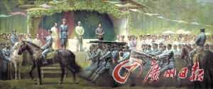 对于潘嘉俊来说,他的黄埔情结似乎更加浓烈些,21年的军旅生涯让他对军事题材的创作格外有激情,“我熟悉黄埔军校,并画过有关的连环画、单幅油画和肖像画”,他说,至今尚未出现一幅表现黄埔军校历史的大型美术作品,同时,“人们记忆中关于阅兵的场景作品也极少”,因此,“另辟蹊径、独树一帜”成为潘嘉俊选题的立意。