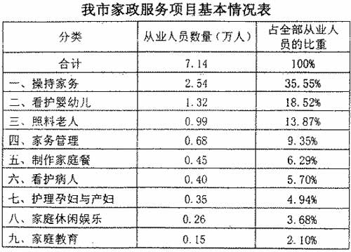 家庭服务业是以家庭为服务对象,以家庭各种事务为服务内容的第三产业,主要包括家庭服务、维修服务、社区导购、房屋租售、人才招聘、法律服务、生活百事等七大类服务内容,涉及千家万户。目前,沈阳有从事该行业的各类家政服务企业558个,现有家政服务从业人员约7.14万人,而社会对家政服务人员的需求则达到11万人。家庭服务业成了当前和今后一个时期促进就业的一条重要渠道。