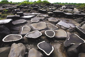 古盐田位于洋浦经济开发区新英湾区办事处盐田村,总面积750亩,有7300多个形态各异的砚式盐槽,年产量500吨,是海南西部独具特色的旅游景点。(张杰 摄)