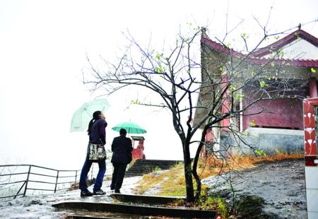 山顶是块巨大石盘。石盘顶上,飞檐红瓦白墙的慈莲庵巍然耸立,庵外三面皆临峭壁,远望如空中楼阁,走近感觉雄奇险峻。站在慈莲庵檐下,不远处的山头立有一块名曰武士岩的石峰,壁立千仞,宛如凛然而立的壮士。向左转身90度,可见一块巨石正守护一旁,身为当地人的老黄说,这便是武婆岩,传说当年匪寇逞凶,武艺高强的武婆多次击败对方,她死后便变成巨石守着寨子,不离不弃。