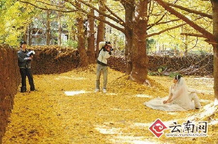 “瞧,又有人在拍婚纱照,咱江东这银杏林子,都可以叫爱情森林了!”昨日下午,给记者介绍情况的固东镇宣传干事黄志明兴奋地介绍,自从银杏叶开始变黄以来,江东村每天都有新人来这里拍摄婚纱照,今年以来少说也有100对以上的新人来银杏村拍过婚纱照。