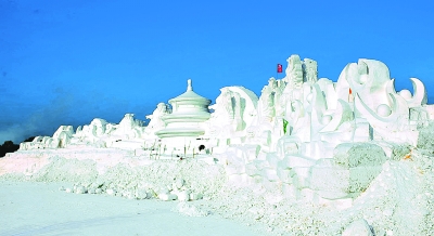 12月17日,长120米、宽9米、高22米的哈尔滨第22届太阳岛雪博会主雕塑“盛世欢歌”在雪雕艺术家的精心雕刻下竣工展现在游人面前。