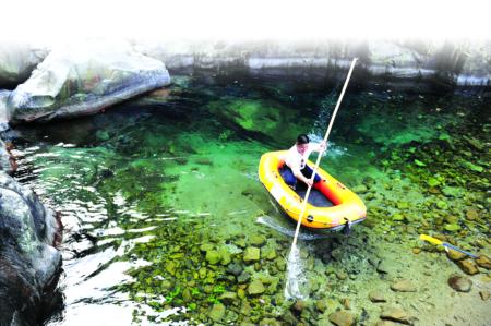 穿越20分钟,峡谷忽地开阔,一潭深水,长宽各约10米,横亘眼前。潭上只有一皮艇,无人摆渡。