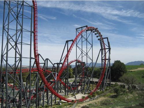因为游客在这套过山车项目上进行一次完整的惊险旅程一共要经历14个360度的环,也被认为是世界上环数最多的过山车项目。这套过山车将坐落在环球恐龙城迪诺水镇内,建成后轨道长1153米,最高时速为126千米,最高点达79米左右,有多个将近90度的垂直大俯冲。目前同样的设备全世界仅有2套,一套在美国的六旗魔术山,另一套在日本的富士急乐园。环球恐龙城即将建设的将是全世界第三套。