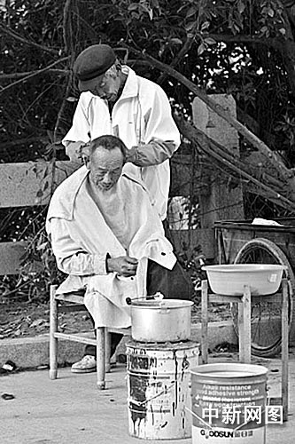 中新网晋江2月20日电 (秦越 )在上个世纪五六十年代,“剃头挑子”很流行,就是一个理发师傅挑着担子摇着铃铛走街串巷,担子一头是洗脸盆架和一个生着火的炉子,另一头是一条长板凳,专门给人理发。近日,记者在闽南侨乡晋江市区莲溪路上就遇见一个这样的“剃头”师傅:和以前不一样的是长板凳换成了靠背椅,扁担换成了三轮自行车。