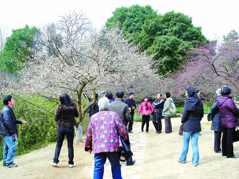 梅花专家胡中指着已绽放吐艳的梅花向记者介绍:那细枝花红、如霞似火的是“朱砂”;那树势高昂、玫瑰色花朵的是“多萼朱砂”;那花色洁白、散发出淡淡幽香的是“白梅”;那花瓣翠绿、晶莹如玉的是“绿萼”…… 随着气温上升,二月下旬是梅花旺花期。届时,灵峰梅花将呈现出五彩缤纷,繁花似锦的景象,令人美不胜收。