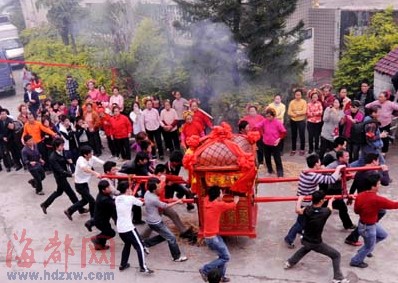 昨天(14日)是正月廿九,妈祖添香日。上午9点,泉州东海埔村,妈祖巡香大典再度上演。埔女盘头插花,戴着丁香耳坠,穿着大裾衫、宽脚裤,形成了一道独特的风景。村民们抬着神像冲过火堆,避灾祈福。这项民俗活动也吸引了福州、厦门等地的很多摄影师前来拍摄。(田米 文/图)