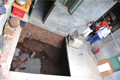 昨天上午,记者在现场看到,这处塌陷坑位于院子的东北侧,上面一块长近3米、宽近2米的石板整体随之塌了下去。从坑内可以看得到房子的地基。