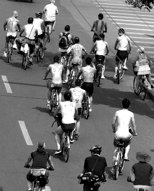 着泳裤、泳装,身上画着五彩花纹,骑着自行车,昨天下午,约有20位网友如此装扮出现在北京的街头。据活动的组织者介绍,该活动意图在于倡导让人们选择方便、环保的自行车出行,“裸露”的人体则是提醒司机要注意骑车人的安全。