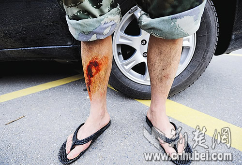 昨日凌晨2点半,庄立程发现身边的人都已睡熟,便借口天热要冲凉进了厕所,随即打破窗户玻璃,翻窗跳到5楼窗台。此时,5楼住户以为是小偷大叫起来,叫声引起6楼传销人员的警觉。庄立程见状,直接从5楼跳到近2米的邻楼3楼楼顶,小腿和手臂多处受伤(如图)。