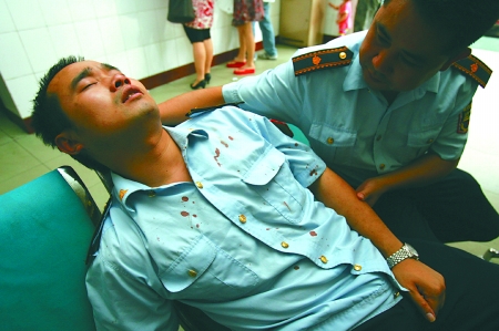 昨日下午,记者在高新区人民医院见到李勇时,他的同事正托着他的头靠在凳子上,脸和上衣的血迹清晰可见,同事解开李勇的上衣扣子,左、右胸前均出现积血淤青。“打不还手是铁的纪律,只能看着他打我。”回忆起当时的情形,李勇痛哭着说,下午2点过,他巡逻至高新区石桥铺赛博广场车站旁,发现6名收售手机的小贩占道经营,便上前劝导摊贩尽快离开。见有城管队员到来,摊贩们随即收拾凳子上摆放的手机。