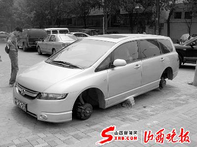 今天(17日),太原市和平北路与漪汾街附近,一辆停在路边的本田商务车引来众多市民围观。这辆车的4个轮子全被卸掉,无法行驶。