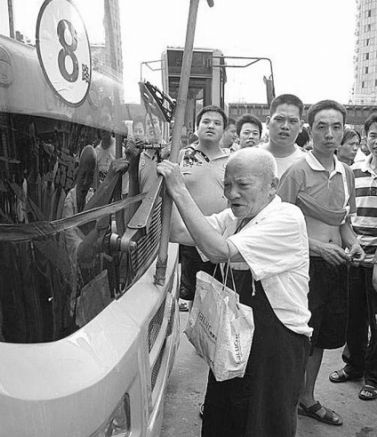 据介绍,当日下午4点左右,8路公交车起点站前,一名白发苍苍、手拿拐杖的老人,手腕上挂着一个纸袋,双手紧紧抓着8路公交车前的雨刮器,不让公交车开走。