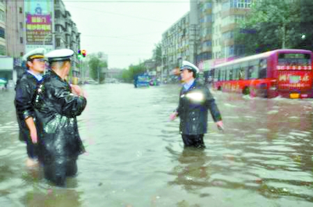 在倾盆大雨中,一个年轻的身影感动了正在陪同客人游览的网友“探路者0379”,于是,他用手中的相机记录下了这感人的场面:一个赤足踩在浑浊的积水中指挥交通的协警。