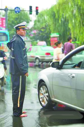 “当时车多、雨大,急于把车辆疏导开,恢复通行,在岗位上,我首先想到的是履行职责,淋雨、丢鞋、趟水那些都来不及顾及了。”戚新峰表示,现在想来,雨水下没有玻璃等锋利东西把脚划破真是万幸,由于当时及时疏导,没有造成负责的路口堵塞,心里挺踏实的。