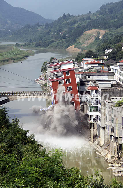 在限期内,房主仍未自行拆除。7月24日,县防汛抗旱指挥部委托湖北宜昌一家爆破公司承担该违法建筑的爆破拆除任务。