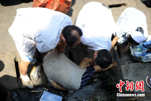 中新网重庆7月30日电(连肖 刘函冉)30日下午14时许,记者路过重庆陈家坪汽车站时看到,一六旬老人倒在车站出站口外的排水沟里。“120”急救人员称,该老人极有可能是因下空调车后,无法适应室外40多度的高温,突发心脑血管疾病猝死。