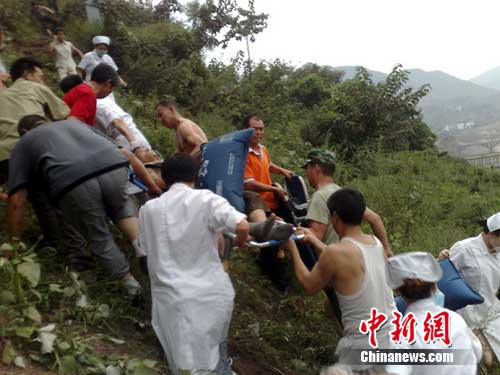 由于出事地点地形十分险要,公路离崖底大约有30米的垂直距离,根本无路可下,情况十分危急,当地村民的协助下找来锄头、铁锹迅速打开了一条临时“生命通道”,赶到现场救援的消防官兵带上破拆工具钻进车内搜救幸存者,伤者被找到并用腰带将伤者固定在担架上,在当地村民和的协助下,用接力的方式抬着担架,将伤者抬上路面,并立即送往县内各大医院进行急救。赶到现场的医务人员判断,车内有一些已无生命迹象。