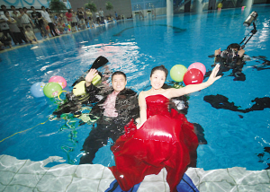 这场浪漫婚礼,代价不菲,仅跳水池的租金就要两万元左右,再加上潜水教练、水下摄像、现场布置,差不多花了四五万元。据了解,这场婚礼的策划正是新娘唐梅。