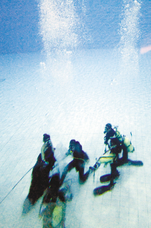 两人浮出水面后,唐梅深吸了一口气。她告诉记者,在水下时其实很紧张,可老公一直握着她的手,就一点都不害怕了。