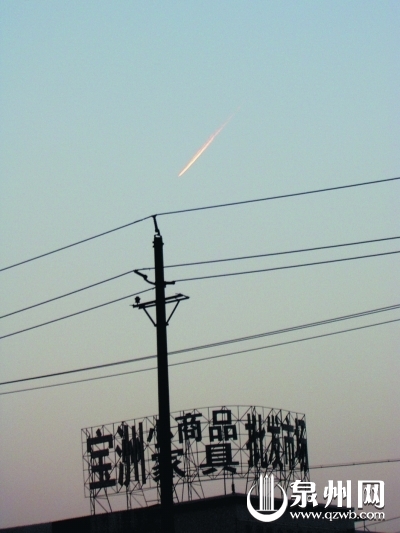 最近的一次是在去年的1月5日傍晚时分,泉州的西北方向上空突然出现一个拖着红色火焰,时长时短的不明飞行物。