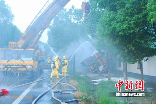 中新网湖州8月18日电(记者 江耘 通讯员 李欢)8月18日凌晨2时01分,位于浙江湖州104国道1376公里处,一辆装载24.26吨苯乙烯的槽罐车发生侧翻,一头撞穿路旁围墙,扎进绿化带泥地中。巨大的冲击力致使大量的苯乙烯液体倾泻到地面。事发地正好位于一村庄旁,距离事发地100多米处是一家烟花爆竹生产厂。苯乙烯属易燃易爆液体,闪点极低,一旦发生爆炸,后果将不堪设想。