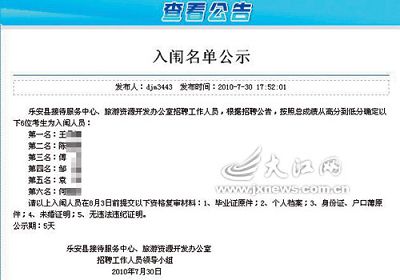记者从乐安县政府网站上的公示栏看到,7月30日有则“入围名单公示”,入选者分别是:王某、陈某、傅某、邹某、袁某和何某。