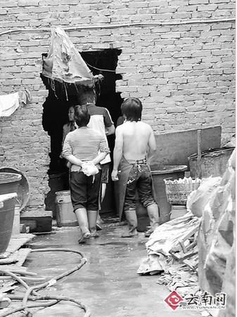 这个豆腐作坊距离昆明市广福路只有一两百米,作坊的房子是临时建筑;作坊里污水四处流淌,到处堆满杂物:有饭桌、碗筷、床板、被褥、鞋、袜、衣服等生活用品,也有高压蒸汽炉、大小塑料桶、箩筐、水管、货架、磨浆机、压板等生产工具,还有黄豆、豆浆和豆腐干等,乱麻麻地堆放在一起;一只大黄猫在泡好的黄豆上来回乱窜,乱舔黄豆。