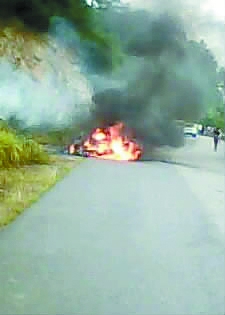 当车队开到余姚梁弄的一条乡镇公路上时,其中一辆法拉利跑车车后的发动机突然冒出了大量浓烟。随后整个车子开始熊熊燃烧,不到半个小时就烧得只剩下个底盘框架,幸亏发现及时,没有人员伤亡。