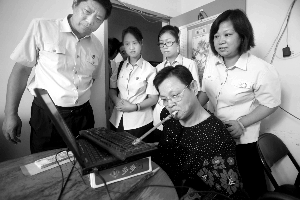 昨日,北京一中院工作人员上门探望患脑瘫的张莉,并为其考上大学的儿子提供资助。张莉多年叼着竹棍点击键盘写作,其自传已出版。她希望用自己的行动激励儿子(本报曾报道)。近日,其子李少晨被北京联合大学录取。他说,打算打工赚学费,像父母期望的那样独立自强。 本报记者 王贵彬 张媛 摄影报道