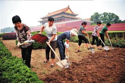 王先生说,他们于当天下午赶至天安门,并依据国庆花卉布置方案开始施工。记者看到,工人们在花池里依弧线掀除草坪,露出的土壤呈裙边状。被掀的草坪堆积在花池外侧,工人们随即用铁锹深松土壤,以备国庆摆花之用。