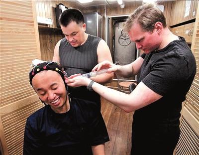 王跃(左一)在模拟舱内进行脑电极试验。俄罗斯生物医学问题研究所供图