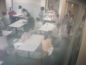 监控室位于医院精神康复中心旁边的一栋三层小楼内。记者来到那里时,朱金红所在位置的影像已被接到一台电脑的屏幕上。王丽娟告诉记者,那是康复中心的食堂,病人们刚刚吃晚饭,有的坐着闲聊,有的已经离开了。“朱金红刚走了,快,打电话让护士把她叫回来。”王丽娟这样吩咐办公室那位工作人员。
