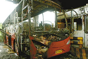 昨天下午2点左右,一辆从广州开往观澜的专线大巴在梅观高速观澜收费站缴费时突然燃起大火,车辆在大火中报废,收费站的一个岗亭也被殃及烧毁。