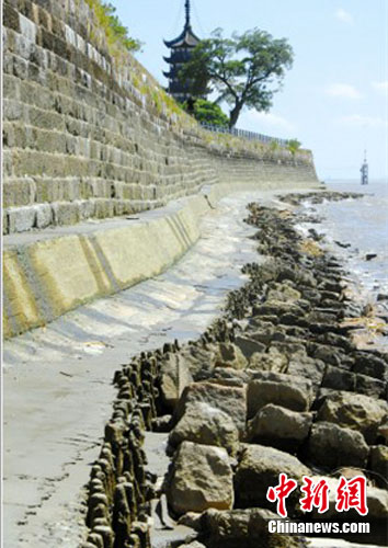 老盐仓丁字坝是观看钱塘江回头潮的宝地,但是随着钱塘江水位下降,丁字坝竟露出了一米多的堤塘。浙江海宁盐官观潮景区管委会副主任张冰瑜告诉记者,水位已经达到了十年来最低。