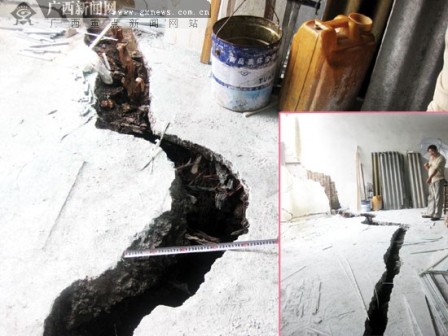 位于南宁市二塘大盘岭的南宁新城福利五金总厂,因受这两天大雨的肆虐,使得该厂建材车间地板突然开裂,出现了一条从车间的围墙裂起一直延伸至地面80多米长、有些地方宽约60厘米的大裂缝,使人看得触目惊心。