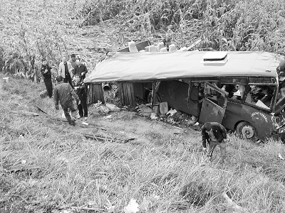 当日下午,记者赶到现场看到,国道南侧一棵白杨树明显有刮擦过的痕迹,地里的玉米秆被压倒一片,周围还有许多血迹和碎玻璃碴,肇事客车已被吊离现场。
