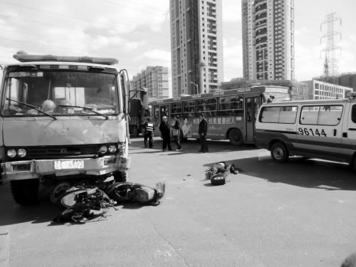 13时许,记者赶到现场。一名约40左右岁的男子躺在交通岗西北侧,头朝东南方向,头部下侧流出最长约40厘米的椭圆形血迹。在他北侧几米远,停着一辆车身带有 “电力抢修”字样的黄色平头大货。车头左前侧轻微凹陷,左前轮下是死者生前骑的电动车,已经严重变形。
