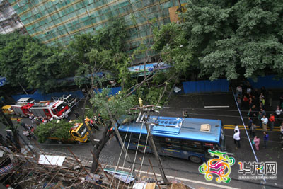 今晨9时50分左右,记者赶到现场看到,这棵巨大的黄葛树已经被“连根拔起”,完全倒下,该路段公路也被倒下的枝干“拦腰截断”,交通完全阻断。枝干下还压着一辆牌照为渝A29665的蓝色公交车,所幸并无人员伤亡。