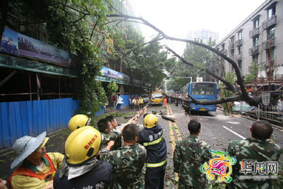 为了尽快将倒下的大树移走,消防官兵只能用电锯一截一截的将树干和树枝锯断运走,同时由于大树枝叶繁茂,不得不动用大量人力用绳索将枝干尽量收拢。