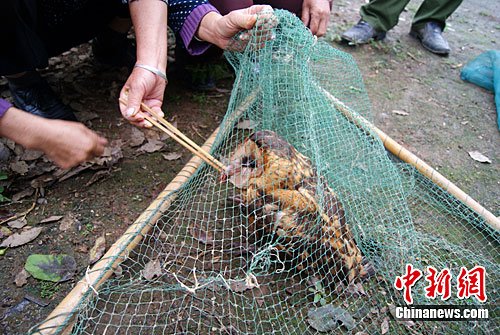 记者看到,这只猴头鹰长着一身黄黑色的毛,两只眼睛黑而有神,爪子尖而有力。可能是受了惊吓担心“安全”问题,一直在网中“扑腾”不停。