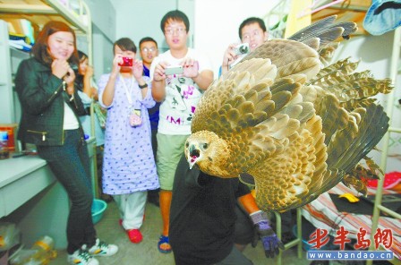 美术学院的女生小刘告诉记者,28日傍晚6时许,她第一个回到宿舍,刚进门阳台外突然飞进来一只大鸟,冲着她的脸扑来,吓得她抱头尖叫,赶紧冲出了宿舍,“我仔细一看才发现是一只老鹰,我很害怕,就叫男生来帮忙了。”