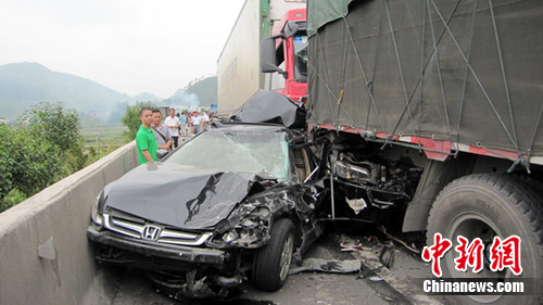 那辆被肇事大车推行了30多米的广本车司机,更是惊魂未定,指着被撞成一堆废铁的爱车说,我与妻子两人在车上,突然被后面的大车碰撞,被向前推了几十米后再次挤碰到前面的大货才停下,车身部分被挤压成铁饼,我们在夹缝中自己爬了出来,幸好只是妻子受了一点刮伤。